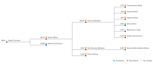 ช่องทางการจัดจำหน่ายที่ได้รับความนิยมมากที่สุด คือ ช่องทางการค้าปลีกแบบออฟไลน์ (Retail Offline) โดยคิดเป็นร้อยละ 85.1 โดยแบ่งเป็นการธุรกิจค้าปลีกที่ร้อยละ 83.7 โดยซื้อผ่านซูเปอร์มาร์เก็ต (Supermarket) ที่ร้อยละ 31 ผ่านไฮเปอร์มาร์เก็ต (Hypermarket) ที่ร้อยละ 33 ร้านค้าลดราคาที่ร้อยละ 2.8 ที่ร้านขายของชำขนาดเล็กที่ร้อยละ 11.4 และร้านคลังสินค้าที่ร้อยละ 2.7 นอกจากนี้ ยังเป็นการซื้อขายจากร้านขายสินค้าทั่วไปที่ร้อยละ 0.9 และการขายตรงที่ร้อยละ 0.5 สำหรับช่องทางการค้าปลีกออนไลน์ มีสัดส่วนอยู่ที่ร้อยละ14.9