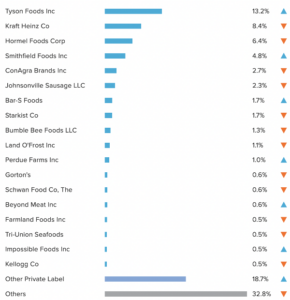 10 อันดับแรกในอุตสาหกรรมเนื้อสัตว์แปรรูปนั้น ได้แก่ บริษัท Tyson Food ที่เป็นเจ้าตลาดของผลิตภัณฑ์เนื้อสัตว์แปรรูปในสหรัฐฯ นั้นและเป็นเจ้าของแบรนด์ผลิตภัณฑ์เนื้อสัตว์แปรรูปชื่อดังในสหรัฐฯ อย่างแบรนด์ Jimmy Dean แบรนด์ Hillshire Farm และแบรนด์ BallPark ที่มีส่วนแบ่งการตลาดมากถึงร้อยละ 13.7 รองลงมาเป็นบริษัท Kraft Heinz ที่ร้อยละ 8.4 และบริษัท Hormel Food มีสัดส่วนอยู่ที่ร้อยละ 6.4 รองลงมา ได้แก่ Smithfield Food ที่มีส่วนแบ่งการตลาดอยู่ที่ร้อยละ 4.8 บริษัท ConAgra Brand ที่ร้อยละ 2.7 และ บริษัท Johnsonville Sausage อยู่ที่ ร้อยละ 2.3 ตามลำดับ