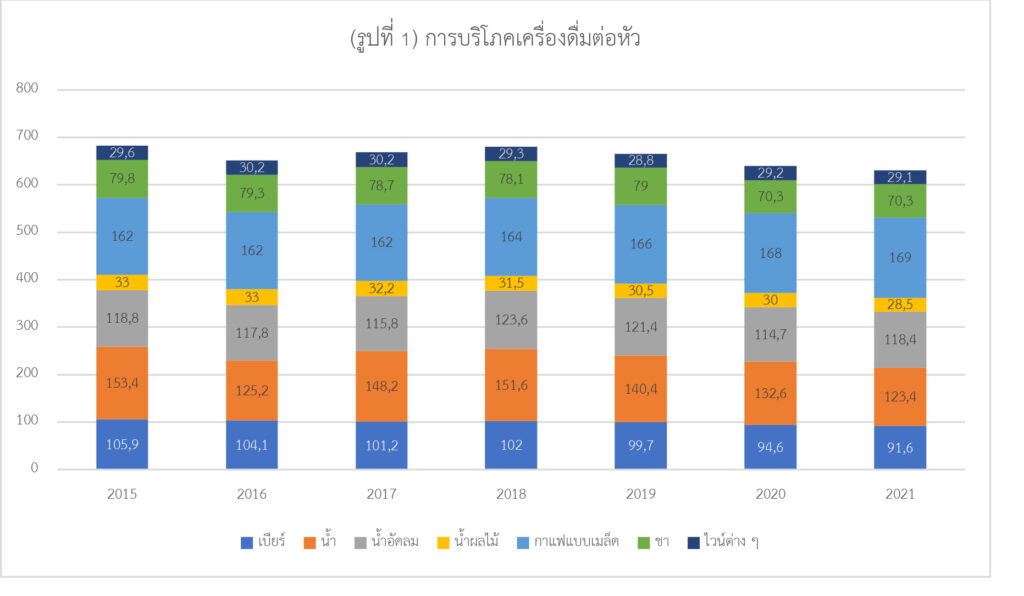 - การบริโภคเครื่องดื่มต่อหัว ปริมาณการบริโภคเครื่องดื่มของชาวเยอรมันต่อปีอยู่ที่ประมาณ 630 ลิตรต่อคน โดยในปี 2564 (รูปที่ 1) บริโภคเครื่องดื่มไม่มีแอลกอฮอล์ (อาทิ น้ำเปล่า น้ำอัดลม และน้ำผลไม้) จำนวน 270 ลิตร ชาและกาแฟ จำนวน 239 ลิตร และเครื่องดื่มแอลกอฮอล์ (อาทิ เบียร์ ไวน์ สปาร์ก- ลิงไวน์ และสุรา) จำนวน 121 ลิตร สำหรับ เครื่องดื่มที่ได้รับความนิยมสูงสุดในเยอรมนียังคงเป็น “กาแฟ” โดยมีการบริโภคต่อคนต่อปีที่ 169 ลิตร รองลงมา คือ น้ำเปล่า 123 ลิตร น้ำอัดลม 118 ลิตร และเบียร์ (รวมเบียร์ไม่มีแอลกอฮอล์และเครื่องดื่มมอลต์) 92 ลิตร สำหรับ พฤติกรรมผู้บริโภคในช่วงโควิด – 2019, ปี 2020 และ 2021 มีการเปลี่ยนแปลงอย่างชัดเจน มาตรการล็อกดาวน์ (ผลกระทบพิเศษ) อาทิ การสั่งปิดร้านอาหาร การทำงานจากที่บ้าน การยกเลิกงานเฉลิมฉลอง/คอนเสิร์ต/งานอีเว้นท์ (ขนาดใหญ่) เป็นต้น ได้ทำให้เกิดการเปลี่ยนแปลง นอกจากนี้ ผู้บริโภคจำนวนมากก็ปรับเปลี่ยนพฤติกรรมการซื้อสินค้าในร้านค้าปลีกดด้วย ทั้งนี้ เพื่อให้เข้ากับสถานการณ์ เนื่องจากใช้วิธี “ช๊อปปิ้งครบวงจร (One - Stop-Shoppings)” พวกเขาจึงซื้อสินค้าน้อยลง แต่บ่อยครั้งขึ้น และการบริโภคเกิดขึ้นที่บ้านเป็นหลัก ต่อมา ภายหลังจากที่ร้านอาหารได้ทยอยกลับมาเปิดตัวอีกครั้ง ในช่วงต้นปี 2022 ทำให้พฤติกรรมผู้บริโภคกลับมาเน้นการบริโภคนอกบ้านมากขึ้น อย่างไรก็ตาม พฤติกรรมการบริโภคและการซื้อในปัจจุบันได้รับอิทธิพลจากภาวะเงินเฟ้อที่สูง และความไม่แน่นอนที่เกี่ยวข้องกับสงครามในยูเครน ผู้บริโภคจำกัดการบริโภค ซื้อของน้อยลง และให้ความสนใจอย่างมากต่อสินค้าราคาถูก เมื่อต้องซื้อสินค้าบริโภค