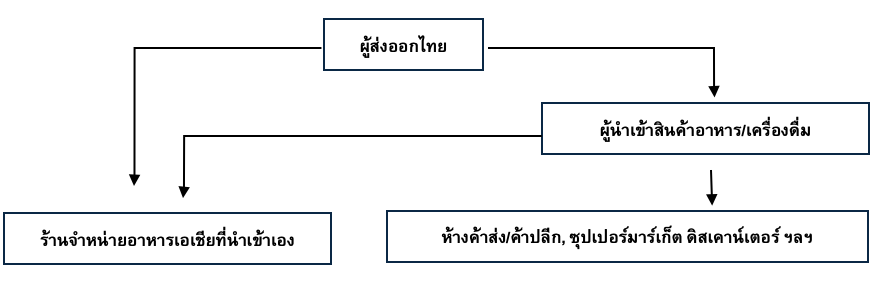 - ช่องทางการจำหน่ายสินค้าอาหารและเครื่องดื่มจากเอเชียในตลาดเยอรมนีได้เพิ่มจากร้านสินค้าเอเชียเข้าสู่ซุปเปอร์มาร์เก็ตมากขึ้น โดยในช่วง 4 – 4 ปีมานี้ ผู้บริโภคทั้งชาวเยอรมนีและเอเชียสามารถเข้าถึงอาหารและเครื่องดื่มเอเชียในซุปเปอร์มาร์เก็ตขนาดใหญ่ได้มากขึ้น โดยช่องทางการเข้าตลาดของสินค้าเครื่องดื่มของไทยสรุปได้ในเบื้องต้น กล่าวคือ