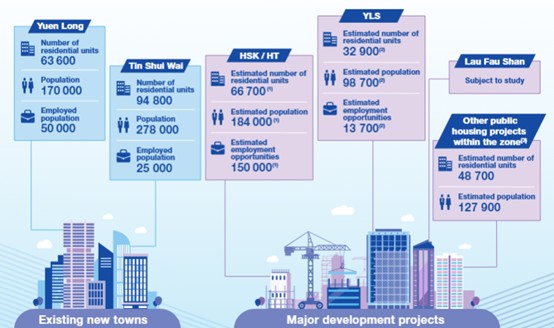 พื้นที่ HSK / HT ได้รับการพัฒนาให้เป็น ศูนย์กลางบริการวิชาชีพระดับสูงของ GBA โดยเน้น บริการทางการเงิน การประกันภัย การบริหารความเสี่ยง กฎหมาย และการให้คําปรึกษาทางธุรกิจ โดยมี พื้นที่เชิงพาณิชย์กว่า 2 ล้านตารางเมตร รอบ สถานี Hung Shui Kiu ซึ่งจะกลายเป็นศูนย์กลาง ธุรกิจหลัก โดยโครงการพัฒนาจะเริ่มในปี 2569 และอาคารชุดแรกจะแล้วเสร็จภายในปี 2573 พื้นที่ HSK / HT ตั้งอยู่ใกล้กับ Shenzhen Bay Port ทําให้เป็น ศูนย์กลางโลจิสติกส์ สมัยใหม่ ที่สําคัญของฮ่องกง ภายใต้ยุทธศาสตร์ "East in East out, West in West out" มีการ จัดสรร พื้นที่อุตสาหกรรมกว่า 70 เฮกตาร์ สําหรับ การพัฒนาอาคารอุตสาหกรรมหลายชั้น (MSBs) เพื่อรองรับ โลจิสติกส์สมัยใหม่ อุตสาหกรรมยานยนต์ และบริการซ่อมบํารุง ซึ่งจะช่วยส่งเสริมการ เติบโตของอุตสาหกรรมโลจิสติกส์ใน GBA พื้นที่ Yuen Long South (YLS) ได้รับการกําหนดให้เป็น เขตที่อยู่อาศัยหลัก โดยสามารถ รองรับที่อยู่อาศัย 30,000 ยูนิต และโครงการที่อยู่อาศัยใน HSK / HT จะมีมากกว่า 66,700 ยูนิต รองรับประชากร 184,000 คน การพัฒนาที่อยู่อาศัยสาธารณะบางส่วนในพื้นที่นี้คาดว่าจะเปิดให้ ประชาชนย้ายเข้าอยู่ภายในไม่กี่ปีข้างหน้า Northern Metropolis จึงเป็นพื้นที่ที่มีศักยภาพสูงในการพัฒนา บริการระดับมืออาชีพ และระบบโลจิสติกส์ที่ทันสมัย ซึ่งจะช่วยยกระดับฮ่องกงให้เป็น ศูนย์กลางธุรกิจและการค้าเชื่อมต่อ กับ GBA ได้อย่างสมบูรณ์