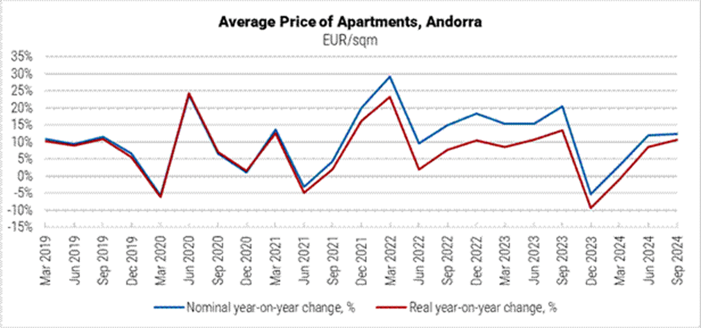 รายงานจาก หน่วยงานสถิติของรัฐบาลอันดอร์รา (DS) ระบุว่า ราคาขายเฉลี่ยของอพาร์ตเมนต์ทั่วประเทศในไตรมาสที่ 3 ปี 2024 อยู่ที่ 4,170 ยูโรต่อตารางเมตร หรือราว 4,594 ดอลลาร์สหรัฐ เพิ่มขึ้น 12.47% จากปีก่อนหน้า และหากปรับตามอัตราเงินเฟ้อแล้วจะเพิ่มขึ้น 10.61% ขณะที่ราคาที่อยู่อาศัยโดยรวม ซึ่งรวมถึงบ้านเดี่ยวและอสังหาริมทรัพย์ประเภทอื่น อยู่ที่ 3,874 ยูโรต่อตารางเมตร เพิ่มขึ้น 12.16% ต่อปี