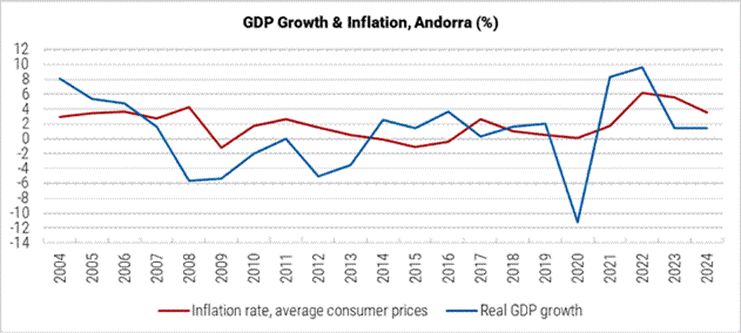 อัตราเงินเฟ้อของอันดอร์ราลดลงอย่างต่อเนื่อง จาก 6.2% ในปี 2022 เหลือ 5.6% ในปี 2023 และคาดว่าจะลดลงอีกในปี 2024 มาอยู่ที่ 3.6% ข้อมูลจากกรมสถิติอันดอร์ราระบุว่าในเดือนธันวาคม 2024 CPI อยู่ที่ 2.6% ขณะที่ IMF คาดการณ์ว่าเงินเฟ้อจะลดลงต่อเนื่องถึง 2.5% ในปี 2025 และ 2% ในปี 2026 ซึ่งจะช่วยบรรเทาค่าครองชีพของประชาชน
