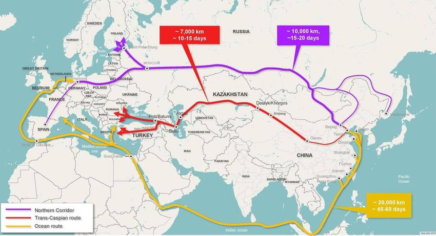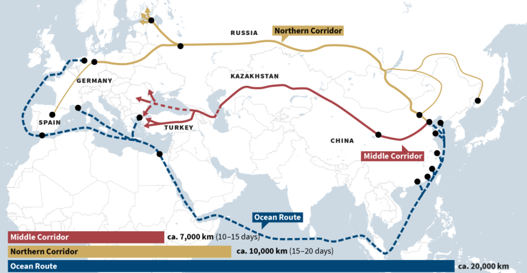 รูปภาพที่ 2 และ 3: เส้นทาง Trans-Caspian Corridor หรือ Middle Corridor ที่มาของข้อมูล: Baku Research Institute และ Common Space