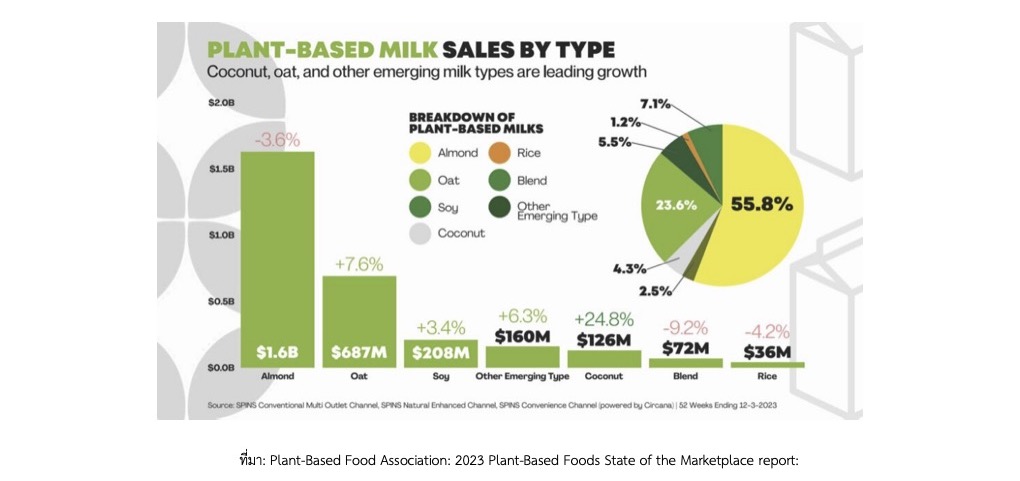 plant-based milk ที่มียอดขายสูงสุดคือ Almond milk และ Oat milk ข้อมูลล่าสุดเมื่อเดือนธันวาคม 2023 ระบุว่ายอดขาย Plant-based Almond milk และ Oat milk มีส่วนแบ่งในตลาดร้อยละ 55.8 และ 23.6 ตามลำดับ และมียอดขายรวมกันเกือบ 2.3 พันล้านเหรียญฯ