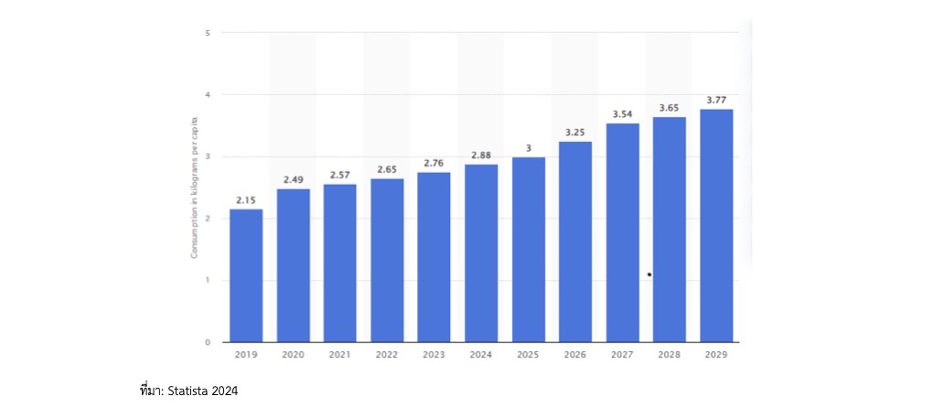 อย่างไรก็ดี งานวิจัยของ Modor Intelligence ในปีเดียวกัน ระบุอัตราการบริโภคที่สูงกว่าคือ 5.36 กิโลกรัมในปี 2024 และจะบรรลุ 8.05 กิโลกรัมในปี 2029