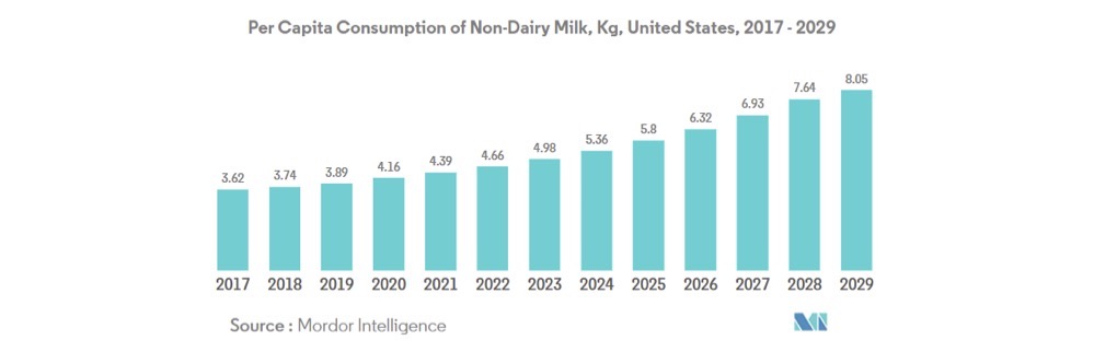 ในปี 2023 ยอดขาย plant-based milk คิดเป็นร้อยละ 15 ของยอดขายสินค้ากลุ่มนม (milk) ทุกประเภทรวมทั้งสิ้น หรือประมาณ 2.9 พันล้านเหรียญฯ เพิ่มขึ้นร้อยละ 1 จากปีก่อนหน้า อย่างไรก็ดีหน่วยขาย plant-based milk ลดลงร้อยละ 8 เหลือ 744 ล้านหน่วย และคิดเป็นร้อยละ 13 ของปริมาณขายสินค้านมทุกประเภทรวมทั้งสิ้น