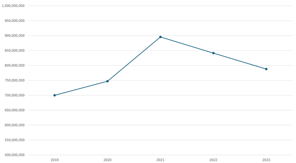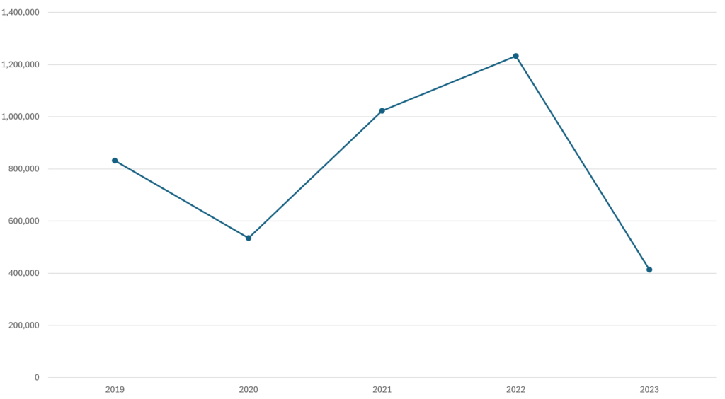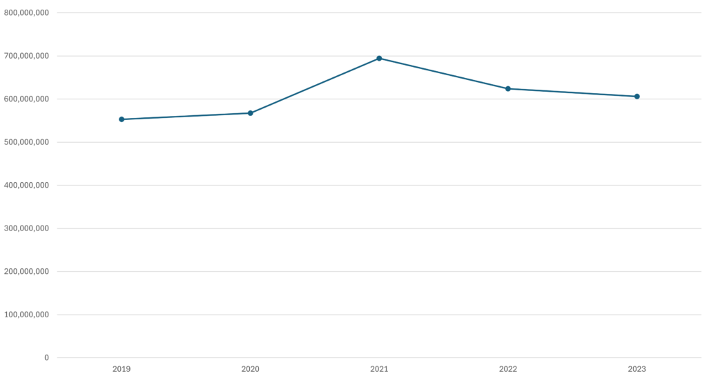 แผนภาพที่ 2: แสดงข้อมูลดุลการค้า และมูลค่าการนำเข้า-ส่งออกสินค้ากุ้งรวม 7 หมวดหมู่ของสหรัฐฯระหว่างปี 2019 – 2023 ข้อมูลจาก Global Trade Atlas