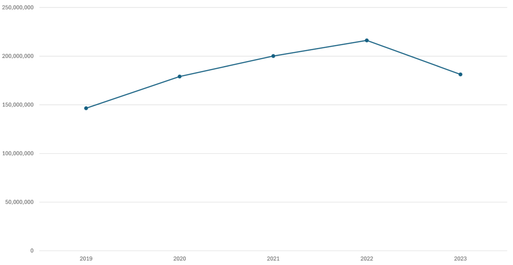 แผนภาพที่ 15: แสดงข้อมูลปริมาณการนำเข้าสินค้ากุ้งแช่แข็งของสหรัฐฯระหว่างปี 2019 – 2023 ข้อมูลจาก Global Trade Atlas