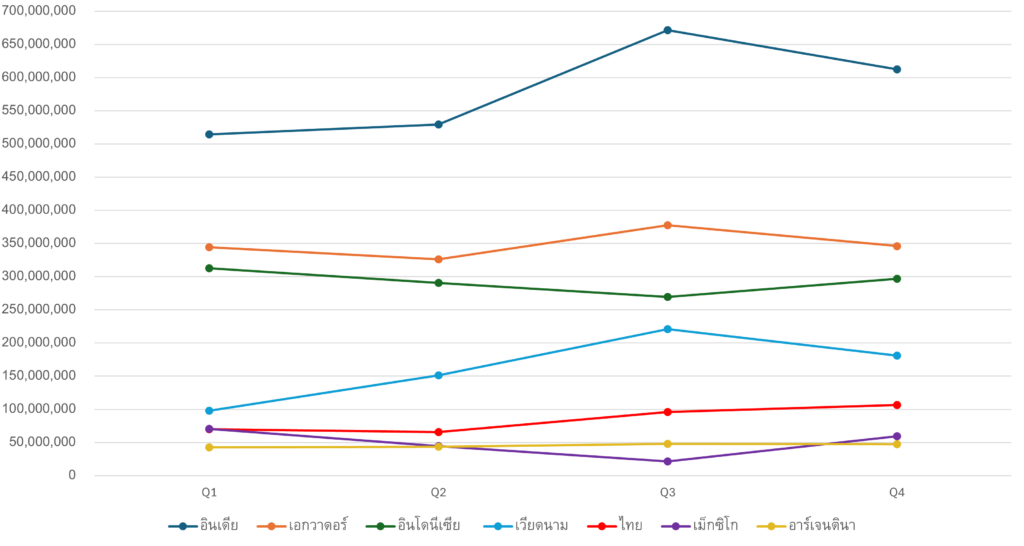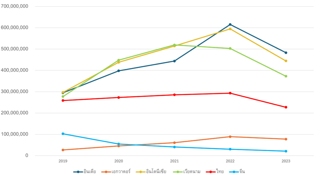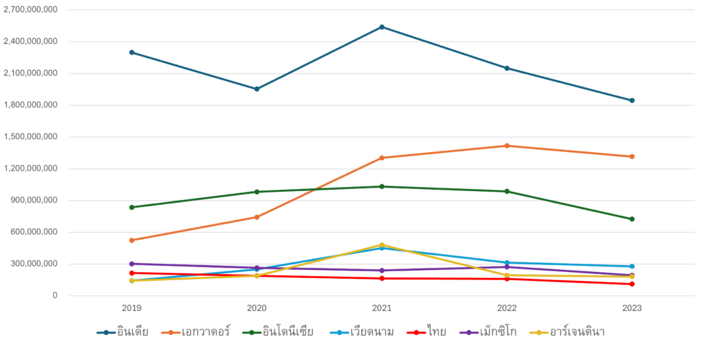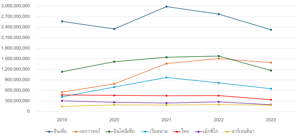 2.4 สถิติการนำเข้าสินค้ากุ้งมายังสหรัฐฯ ในปี 2023 ที่ผ่านมาสหรัฐฯนำเข้าสินค้ากุ้ง (นับเฉพาะหมวดหมู่สินค้าตาม HS Code ทั้ง 7 หมวดหมู่ตาม 2.2) มีมูลค่าจาก 7 อันดับประเทศแรก ได้แก่ 1. อินเดีย (ร้อยละ 36) 2. เอกวาดอร์ (ร้อยละ 21) 3. อินโดนีเซีย (ร้อยละ 18) 4. เวียดนาม (ร้อยละ 10) 5. ประเทศไทย (ร้อยละ 5) 6. เม็กซิโก (ร้อยละ 3) และ 7. อาร์เจนตินา (ร้อยละ 2) ซึ่งจากข้อมูลที่ปรากฎในแผนภาพที่ 3 จะเห็นได้ว่าประเทศอินเดียมีมูลค่าการส่งออกสินค้ากุ้งที่เยอะที่สุดในช่วง 5 ปีให้หลังซึ่งทิ้งห่างจากประเทศอื่น ๆ อย่างมาก สอดคล้องกับข้อเท็จจริงว่าสินค้ากุ้งจาdประเทศอินเดียมีส่วนแบ่งในตลาดสหรัฐฯกว่าร้อยละ 40 ในปัจจุบัน สินค้ากุ้งจากเอกวาดอร์ได้รับความนิยมและมีส่วนแบ่งในตลาดเพิ่มสูงขึ้น ในขณะที่มูลค่าการนำเข้าสินค้ากุ้งจากประเทศไทยนั้นถือว่าค่อนข้างทรงตัวในช่วง 5 ปีที่ผ่านมา