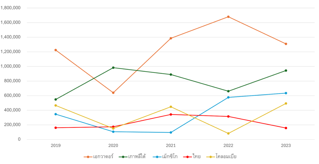 แผนภาพที่ 9: แสดงข้อมูลมูลค่าการนำเข้าสินค้ากุ้งสดของสหรัฐฯจากประเทศ 5 อันดับแรกระหว่างปี 2019 – 2023 ข้อมูลจาก Global Trade Atlas