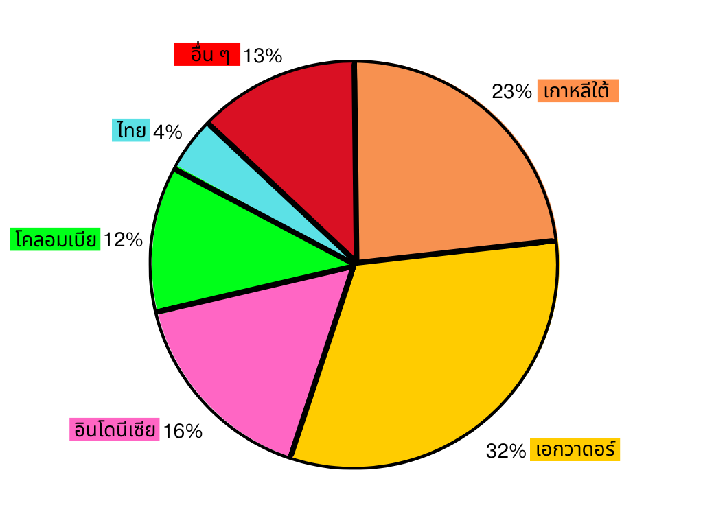 แผนภาพที่ 1: แสดงข้อมูลสัดส่วนสินค้ากุ้งที่นำเข้ามายังสหรัฐฯ โดยคำนวณจากมูลค่าการนำเข้าของสินค้าทั้งหมด ข้อมูลจาก Global Trade Atlas