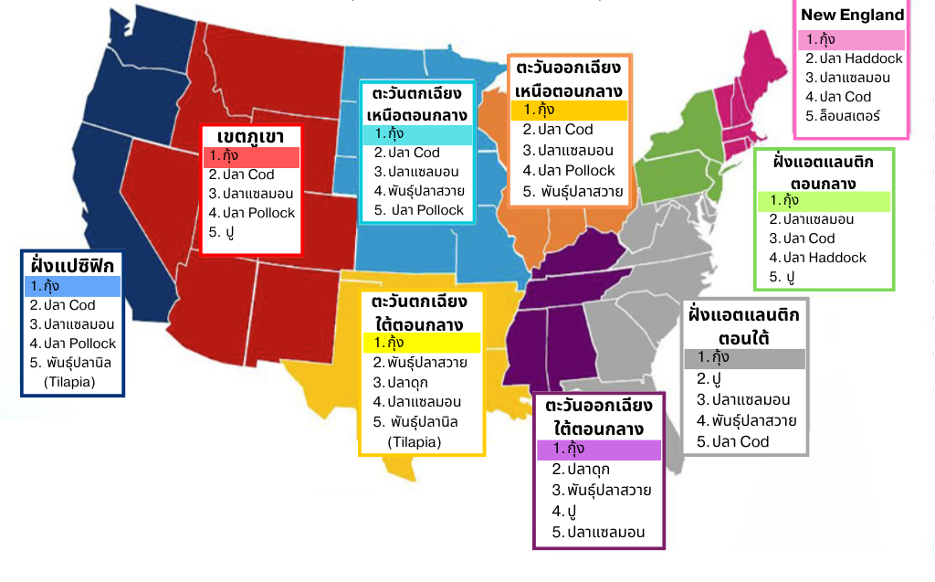 แผนภาพที่ 17: ข้อมูลอาหารทะเลแช่แข็งที่ได้รับความนิยมสูงสุด 5 อันดับแรก แบ่งตามภูมิภาคของสหรัฐฯ (วัดจากยอดขายของสินค้าแต่ละชนิด) ข้อมูลจาก National Fisheries Institute สหรัฐฯ