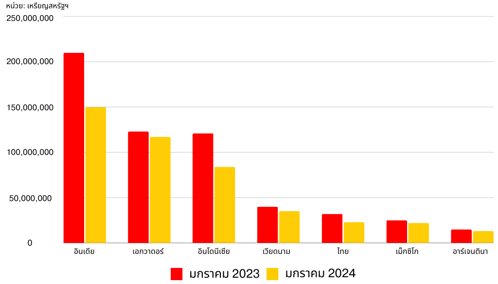 แผนภาพที่ 5: แสดงข้อมูลมูลค่าการนำเข้าสินค้ากุ้งรวม 7 หมวดหมู่ของสหรัฐฯ เปรียบเทียบระหว่างเดือนมกราคม 2023 และ 2024 ข้อมูลจาก Global Trade Atlas