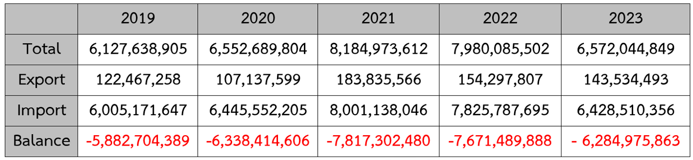 2.3 ภาพรวมมูลค่าการค้าสินค้ากุ้งของสหรัฐฯ มูลค่าการค้าระหว่างประเทศกลุ่มสินค้ากุ้งของสหรัฐฯในภาพรวม ถือว่าอยู่ในสภาพขาดดุลทางการค้าอย่างต่อเนื่องในช่วงระหว่างปีค.ศ. 2019 – 2023 หรือ 5 ปีให้หลัง ซึ่งสอดคล้องกับข้อเท็จจริงของสัดส่วนสินค้ากุ้งในตลาดสหรัฐฯ ที่สินค้าที่ผลิตในสหรัฐนเองมีสัดส่วนเพียงร้อยละ 5 เท่านั้น