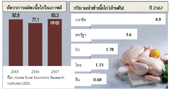 การห้ามนำเข้าไก่จากบราซิลอาจส่งผลให้ราคาผลิตภัณฑ์จากไก่ปรับตัวสูงขึ้น จากสถิติของ Korea Meat Distribution Export Association พบว่า ในปี 2566 บราซิลครองสัดส่วนสูงถึงร้อย 88 ของการนำเข้าไก่ทั้งหมดของเกาหลีใต้ โดยไก่แช่แข็งที่นำเข้าจากบราซิลส่วนใหญ่ จะถูกนำไปใช้ทำเมนูไก่ไม่มีกระดูก