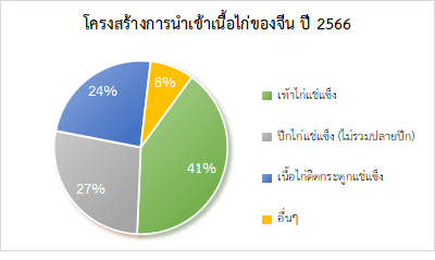 ประเทศแหล่งนำเข้าเนื้อไก่ของจีนยังคงเป็นประเทศบราซิล สหรัฐอเมริกา รัสเซีย ไทย และเบลารุสเป็นหลัก ในปี 2566 ปริมาณการนำเข้าเนื้อไก่จากประเทศดังกล่าวของจีนอยู่ที่ 679,300 ตัน 254,000 ตัน 127,800 ตัน 120,900 ตัน และ 68,700 ตัน ตามลำดับ หากพิจารณาจากประเภทเนื้อไก่นำเข้า พบว่า เท้าไก่แช่แข็งมีสัดส่วนการนำเข้ามากที่สุดถึง 529,800 ตัน คิดเป็นร้อยละ 40.68 ของปริมาณการนำเข้าทั้งหมด ปริมาณการนำเข้าปีกไก่แช่แข็ง (ไม่รวมปลายปีก) อยู่ที่ 356,300 ตัน คิดเป็นร้อยละ 27.36 ของปริมาณการนำเข้าทั้งหมด ส่วนปริมาณการนำเข้าเนื้อไก่ติดกระดูกแช่แข็งอยู่ที่ 309,800 ตัน คิดเป็นร้อยละ 23.79 ของปริมาณการนำเข้าทั้งหมด