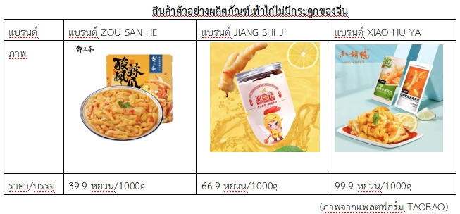 ในขณะเดียวกัน ปัจจุบัน ผลิตภัณฑ์เท้าไก่ไม่มีกระดูกกำลังได้รับความนิยมอย่างมากจากผู้บริโภคชาวจีน ซึ่งถือว่าเป็นผลิตภัณฑ์ที่มีศักยภาพสูงในตลาดจีน เช่น เท้าไก่ไม่มีกระดูกรสเผ็ด เท้าไก่ไม่มีกระดูกรสมะนาว เท้าไก่ไม่มีกระดูกรสกระเทียม เป็นต้น ในปี 2566 ตลาดออนไลน์ของผลิตภัณฑ์เท้าไก่ไม่มีกระดูกของจีนอยู่ที่ 4.98 พันล้านหยวน เพิ่มขึ้นร้อยละ 16.5 (YoY) ผู้บริโภคชาวจีนจะนิยมสั่งซื้อผลิตภัณฑ์เท้าไก่ไม่มีกระดูกผ่านแพลตฟอร์มอีคอมเมิร์ซออนไลน์ ซึ่งคิดเป็นสัดส่วนมากกว่าร้อยละ 70 ของช่องทางการสั่งซื้อทั้งหมด ผู้บริโภคชาวจีนมีร้อยละ 62.25 จะซื้อเท้าไก่ไม่มีกระดูก 1-3 ครั้งต่อเดือน และมีผู้บริโภคร้อยละ 40.46 ใช้จ่ายเฉลี่ย 41-60 หยวนต่อครั้งในการซื้อเท้าไก่ไม่มีกระดูก ทั้งนี้ ผลิตภัณฑ์อาหารเท้าไก่ไม่มีกระดูกมีฐานการบริโภคอยู่ในระดับหนึ่ง และมีความถี่ในการบริโภคจากลูกค้าที่มั่นคงในตลาดจีน โดยเฉพาะผลิตภัณฑ์ที่มีราคาปานกลางถึงสูงถือว่ามีศักยภาพค่อนข้างสูงในตลาด