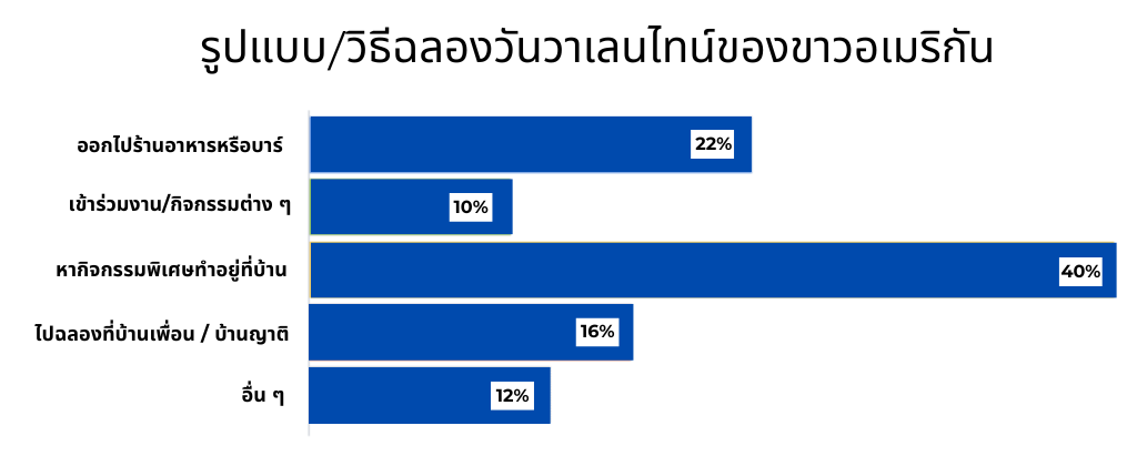 ในปีนี้ชาวอเมริกันกว่าร้อยละ 50 มีแผนในใจที่จะฉลองวันวาเลนไทน์ ซึ่งเพิ่มขึ้นจากปีที่แล้วร้อยละ 2 ซึ่งในจำนวนนี้ ชาวอเมริกันกว่าร้อยละ 40 เลือกที่จะฉลองอยู่ที่บ้าน โดยจะหากิจกรรมพิเศษทำร่วมกันแทนที่จะต้องออกไปฉลองข้างนอก ในขณะที่มีจำนวนร้อยละ 22 ยังคงเลือกที่จะออกไปฉลองกันที่ร้านอาหาร หรือบาร์ที่บรรยากาศดี และอีกร้อยละ 16 เลือกที่ฉลองวันแห่งรักไปกับครอบครัวหรือกับเพื่อน โดยเป็นที่น่าสังเกตว่าในปีนี้ผลการสำรวจแสดงให้เห็นว่ามีผู้คนที่เลือกจะฉลองกับเพื่อนหรือครอบครัวเพิ่มขึ้นจากปีที่แล้ว