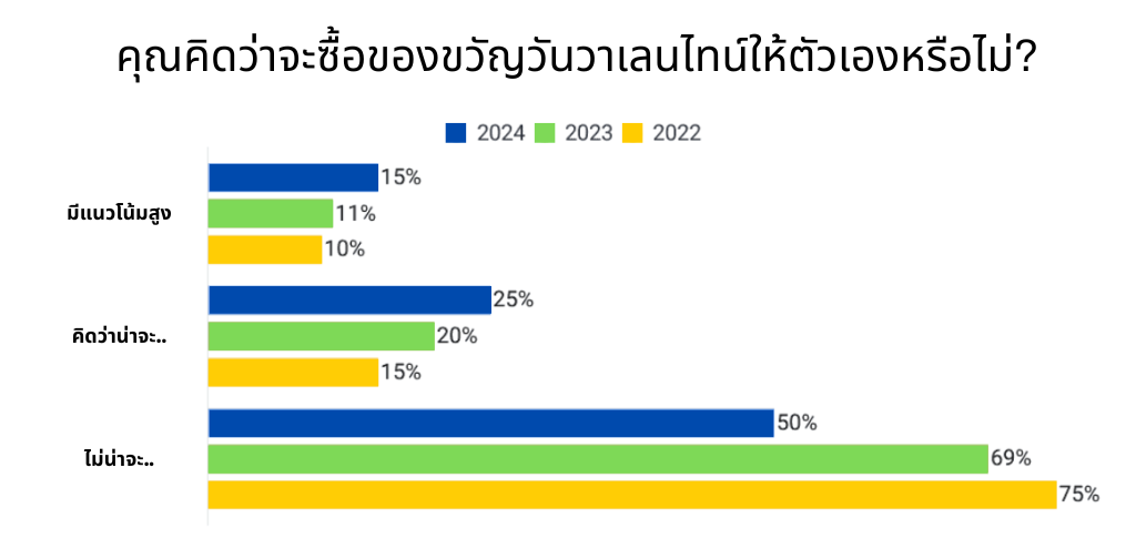แผนภาพที่ 2:แสดงผลการสำรวจความคิดเห็นในการซื้อของขวัญให้ตัวเองในวันวาเลนไทน์ปีนี้ของหญิงชาวอเมริกันที่มีอายุ 18 ปีขึ้นไป เปรียบเทียบข้อมูลย้อนหลัง 3 ปี โดยผลการตอบแบบสำรวจ 1,082 เมื่อวันที่ 1 – 6 กุมภาพันธ์ 2567, ผลการตอบแบบสำรวจ 1,606 ราย เมื่อวันที่ 6 – 10 กุมภาพันธ์ 2566 และ ผลการตอบแบบสำรวจ 2,033 ราย เมื่อวันที่ 31 มกราคม – 7 กุมภาพันธ์ 2565