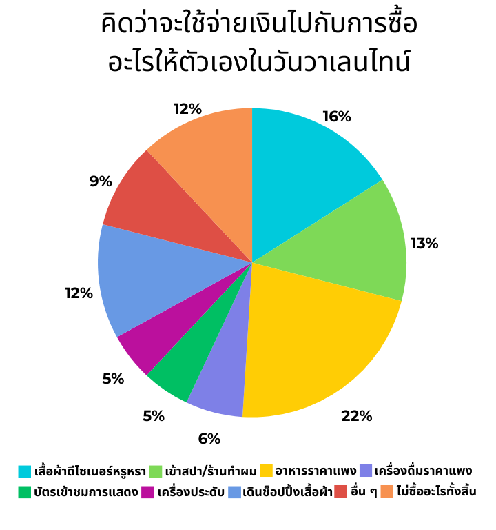 ชุดคำถามที่ต่อเนื่องกันจากหัวข้อที่ 2 ในข้างต้น ว่าหากคุณมีแผนที่จะซื้อของขวัญให้กับตัวเอง หรือมีแผนที่จะฉลองวันวาเลนไทน์นี้กับตัวเอง คุณจะใช้จ่ายเงินไปกับการซื้อสินค้าหรือทำกิจกรรมใด จากผลการสำรวจพบว่าในกลุ่มของคนที่มีแผนอยู่แล้วนั้น เลือกที่จะจ่ายให้กับมื้ออาหารที่หรูหราราคาแพงมากที่สุด ที่ร้อยละ 22 อันดับต่อมาคือการเลือกซื้อสินค้าเสื้อผ้าที่มีแฟชันดีไซน์ราคาแพงร้อยละ 16 และการเข้าสปาดูแลผิวพรรณหรือร้านทำผมเป็นตัวเลือกอันดับที่ 3 โดยอยู่ที่ร้อยละ 13 และตัวเลือกอื่น ๆ ตามลำดับที่ปรากฎในแผนภาพข้างต้น