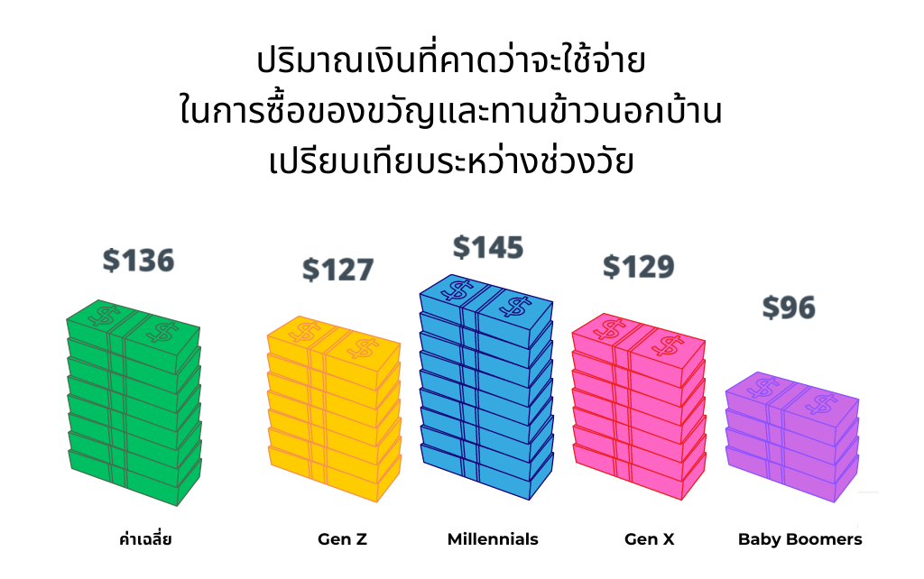 หากพิจารณาพฤติกรรมการใช้จ่ายโดยจำแนกตามช่วงวัยของผู้บริโภค พบว่าภาพรวมในการใช้จ่ายสำหรับการซื้อของขวัญและทานข้าวนอกบ้านระหว่างผู้บริโภคกลุ่ม Gen Z (อายุไม่เกิน 27 ปี) และกลุ่ม Gen X (อายุ 44 - 59) แตกต่างกันเพียง 2 เหรียญสหรัฐฯ โดยกลุ่ม Gen X มีปริมาณเงินที่คาดว่าจะใช้จ่ายสูงกว่า ขณะที่มีกลุ่ม Millennials (อายุ 28 – 43 ปี) มีปริมาณเงินที่คาดว่าจะใช้จ่ายสูงที่สุดอยู่ที่ 145 เหรียญสหรัฐฯ และกลุ่ม Baby Boomer (อายุ 60 ปีขึ้นไป) มีปริมาณเงินที่คาดว่าจะใช้จ่ายน้อยที่สุด
