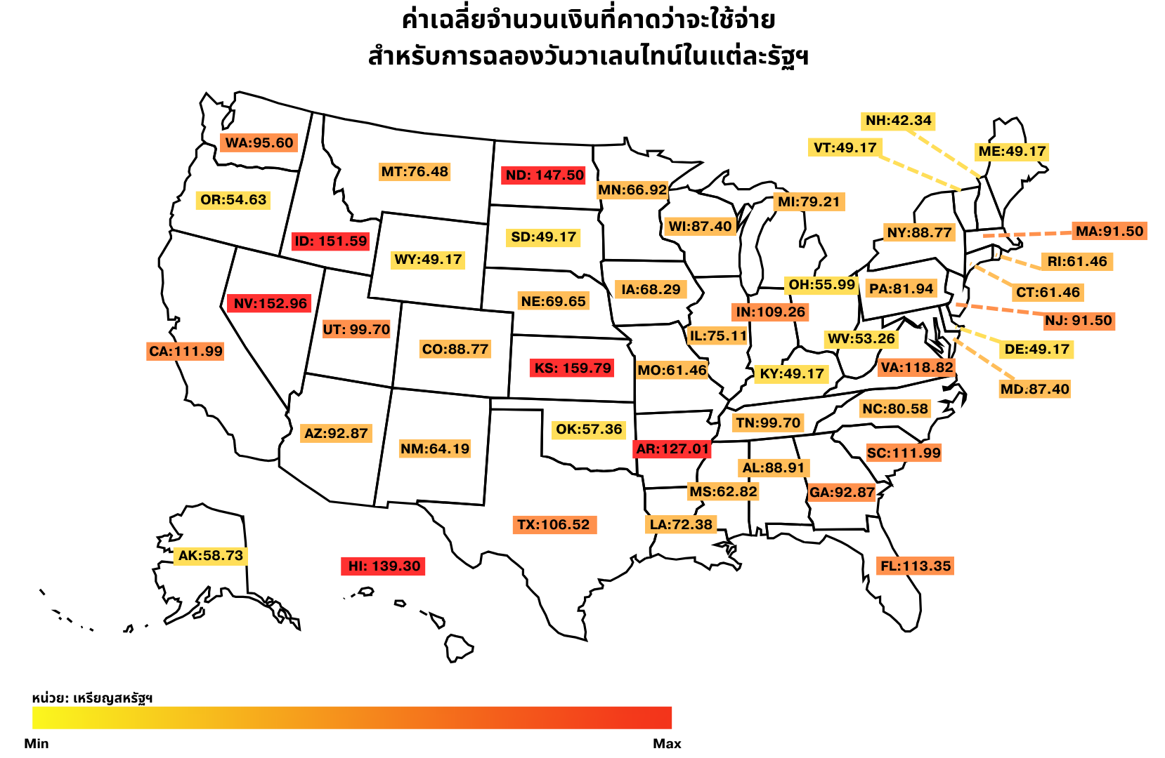 แผนภาพที่ 6: แสดงปริมาณเงินที่คาดว่าจะใช้จ่ายโดยเฉลี่ยสำหรับการฉลองวันวาเลนไทน์ในสหรัฐฯ โดยจำแนกรายรัฐ