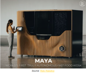 8. การใช้เทคโนโลยีระบบอัตโนมัติในธุรกิจอาหารฟาสต์ฟู้ด (Autonomous fast food kiosk) บริษัท Rolo Robotics ได้เปิดตัว Maya ระบบเครื่องทำอาหารอัตโนมัติแบบครบวงจรระบบแรกของโลก โดยใช้ระบบผสมผสาน AI และการทำงานแบบหุ่นยนต์เข้าด้วยกันในการเตรียมทอดอาหารและเสิร์ฟให้กับผู้บริโภคได้ทั้งอาหารหลัก เครื่องเคียง และเครื่องดื่ม นอกจากนี้ Maya ยังสามารถจัดการหลายคำสั่งได้ในเวลาเดียวกัน อีกทั้งยังมีสามารถปรับแต่งตามความต้องการได้ เช่น การปรุงรสชาติ เลือกซอสที่ต้องการ ระดับความกรอบ และ Maya ยังมีเทคโนโลยีทำความสะอาดตัวเองและได้รับการออกแบบให้ทำงานตลอด 24 ชั่วโมงทุกวันโดยไม่ต้องมีผู้ดูแล ซึ่งจะช่วยแก้ปัญหาเรื่องการขาดแคลนแรงงานในงานบริการ และระบบอัตโนมัติมีแนวโน้มที่จะเข้ามามีบทบาทในการแก้ปัญหากระบวนการต่างๆ มากขึ้น