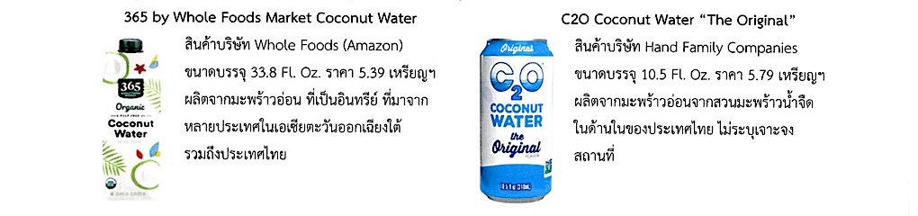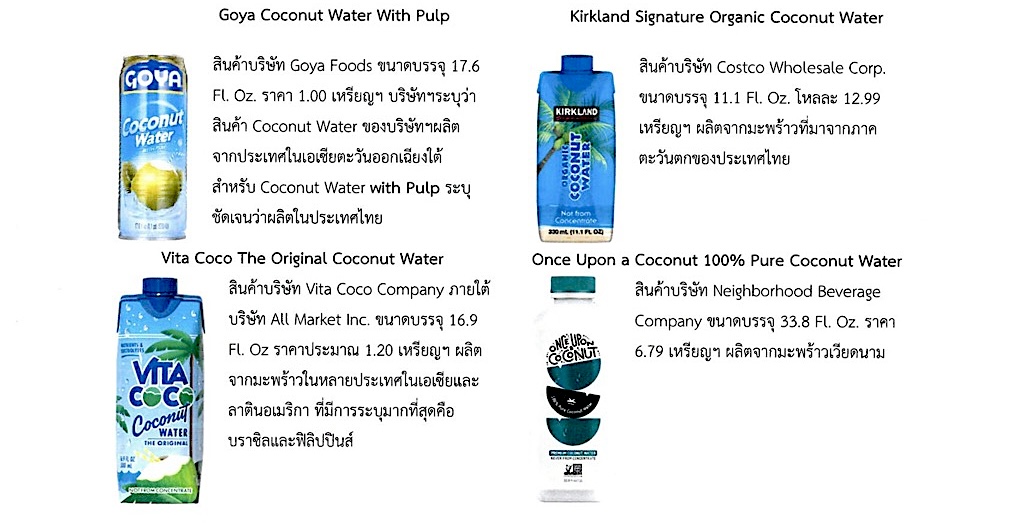 Serious Eats สื่อออนไลน์ด้านอาหารและเครื่องดื่มที่มีชื่อเสียงของสหรัฐฯ ได้ทำการทดสอบเครื่องดื่ม coconut water 10 แบรนด์ ที่วางจำหน่ายใน supermarket หรือร้านค้าออนไลน์ในสหรัฐฯ วิธีการทดสอบจะกระทำอย่างยุติธรรมกับทุกสินค้า คือ ในการทดสอบแต่ละครั้งผู้ทำการทดสอบแต่ละรายจะได้รับสินค้าไปทดสอบแตกต่างกัน ผู้ทำการทดสอบจะไม่ทราบชื่อแบรนด์ และไม่ได้รับอนุญาตให้ปรึกษาหารือกัน ผู้ทำการทดสอบจะให้คะแนนเรื่อง ความหวานที่เป็นธรรมชาติ มีรสชาติสะอาดของมะพร้าวเมืองร้อน รสมันๆ (nutty) ที่ให้ความรู้สึกสดชื่น ให้ความรู้สึกลื่นนุ่มนวลมากกว่าน้ำเปล่า มีรสเปรี้ยว ไม่เหม็นหืน และไม่กลิ่นหวานแบบรุนแรง คะแนนทั้งหมดที่ได้รับจะถูกนำมาคำนวน โดยไม่ถูกแทรกแซง แบรนด์ที่ได้คะแนนอันดับ 1 และ 2 ระบุแหล่งที่มาจากประเทศไทย สินค้าที่กล่าวอ้างว่าผลิตจากมะพร้าวน้ำหอม จะมาจากแหล่งเดียวคือประเทศไทย