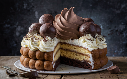 เค้ก Bossche Bollicious ที่สร้างโดย AI ซึ่งมีชื่อและสูตรที่สร้างขึ้นโดย Chat GPT และภาพที่สร้างโดยโปรแกรมสร้างภาพ Ideogram