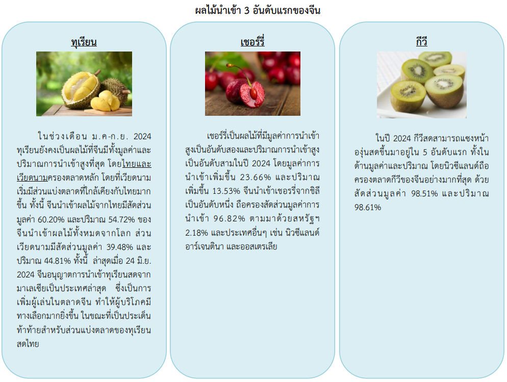 ข้อมูลจาก Produce Report ตั้งแต่ปี 2022-2024 ไทย ชิลี เวียดนาม นิวซีแลนด์ และฟิลิปปินส์ยังคงเป็นแหล่งนำเข้าผลไม้หลักของจีน โดยในช่วงเดือน ม.ค. -ก.ย. 2024 มูลค่าการนำเข้าจากประเทศไทยอยู่ที่ 5,286 ล้านเหรียญสหรัฐ ชิลี 3,249 ล้านเหรียญสหรัฐ เวียดนาม 3,020 ล้านเหรียญสหรัฐ นิวซีแลนด์ 717 ล้านเหรียญสหรัฐ และฟิลิปปินส์ 356 ล้านเหรียญสหรัฐ