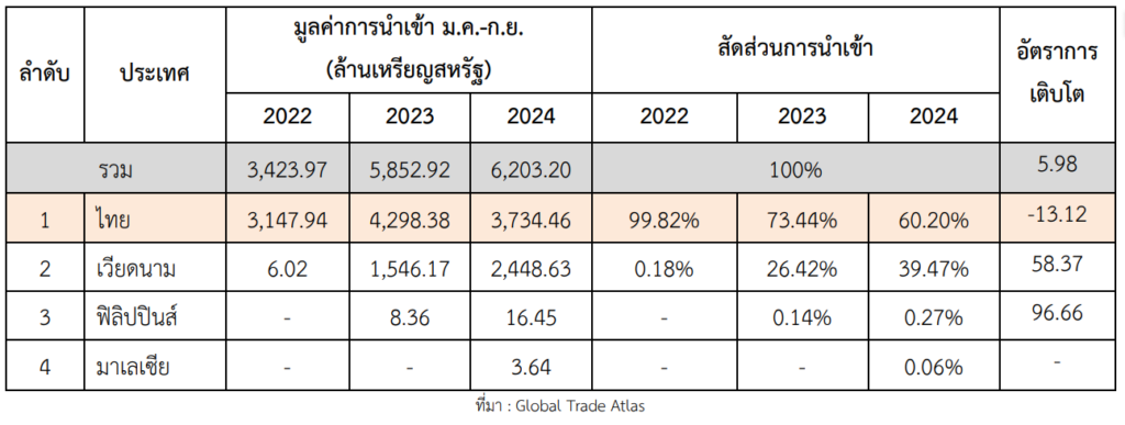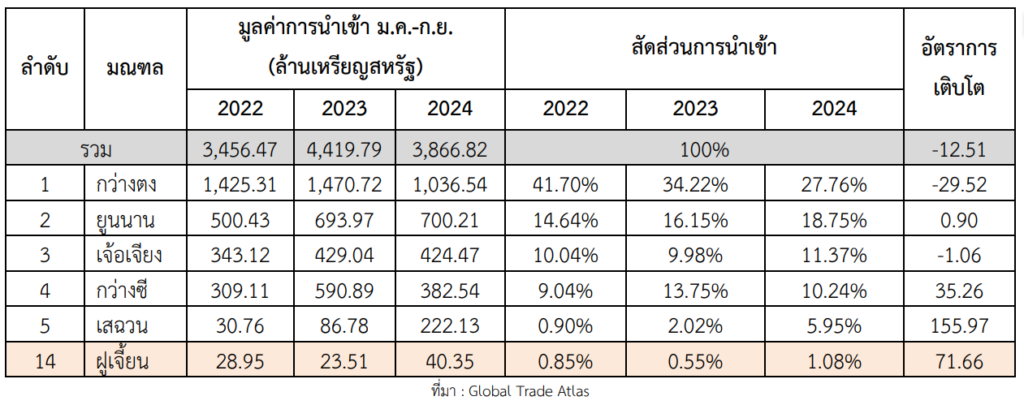 ข้อมูลจาก Global Trade Atlas ระหว่างเดือนมกราคม – กันยายน 2567 พิกัดศุลกากร (HS Code) 081060 สินค้าประเภท ทุเรียนสด จีนนำเข้าหลักจากประเทศไทย และ เวียดนาม โดยนับแต่ปี 2022-2024 จีนยังคงมีการนำเข้าทุเรียนสดจากไทยเป็นอันดับหนึ่ง โดยในปี 2024 มีมูลค่าการนำเข้าอยู่ที่ 3,734.46 ล้านเหรียญ-สหรัฐ และมีสัดส่วนการนำเข้าอยู่ที่ 60.20% ในขณะที่สัดส่วนการนำเข้าลดลง 13.12% YoY